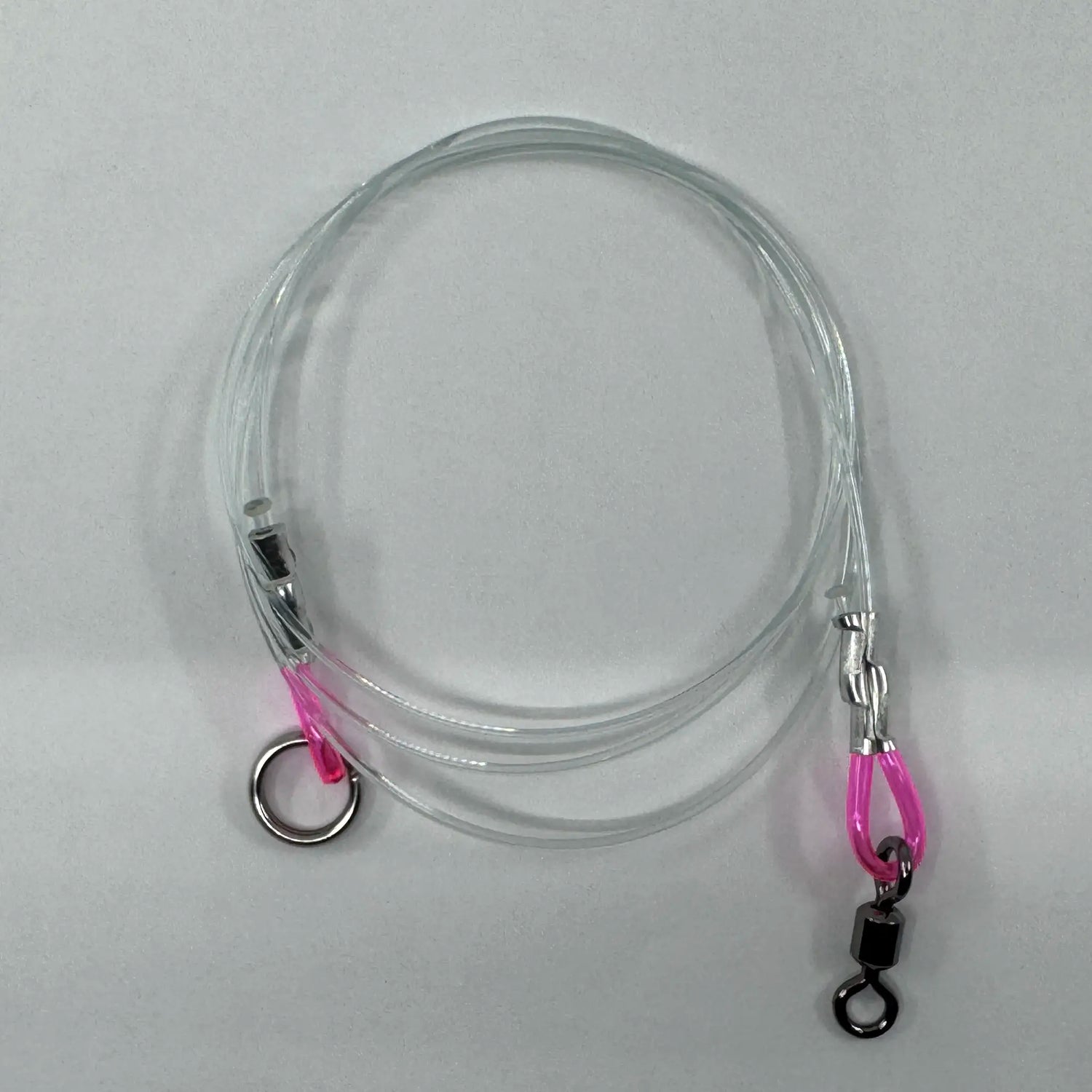 Tuna jig leaders are a must for night time tuna jigging, the chafe and abrasion resistance is required to land most of the bigger fish. This is a convenient precrimped leader featuring a split ring and swivel making it easy to switch out your jig or leader whenever needed.